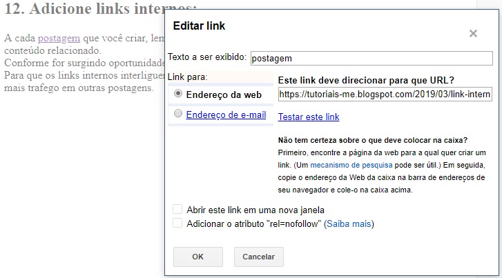 Para adicionar um link interno, selecione o texto, em seguida clique em link, coloque a URL que deseje vincular, marque “Abrir este link em uma nova janela” e “Adicionar o atributo “rel=nofollow”, siga o exemplo abaixo.